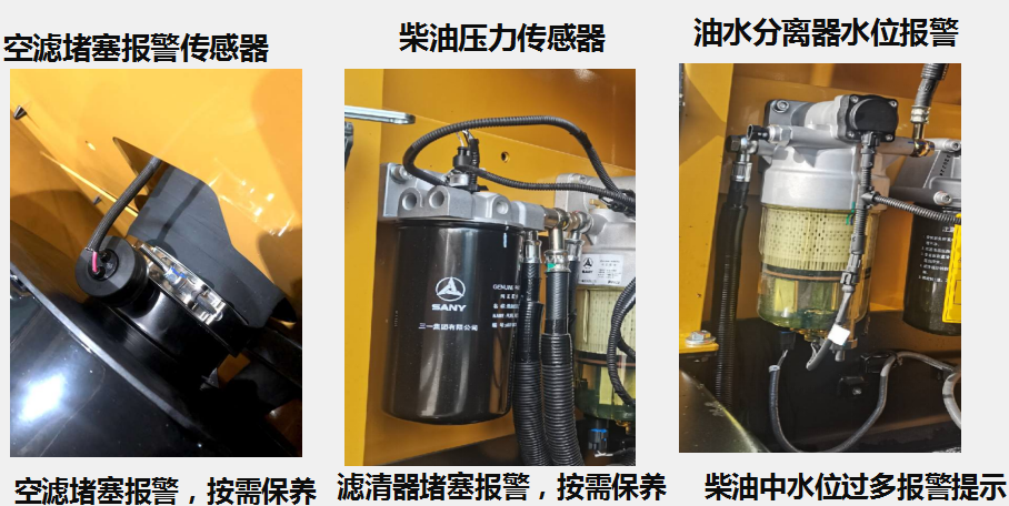 空滤堵塞报警、滤清器堵塞报警、柴油水位报警等多个报警系统的运用,使得用户能够按需保养,大大降低的保养成本。