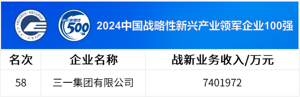 在 “2024中国战略性新兴产业领军企业100强”,三一集团位列第58名。在推动产品电动化的同时,三一集团将新能源产业作为实现事业第二增长曲线的主攻方向,深度布局风能、光伏、氢能、锂电、储能等多个领域,取得积极进展。