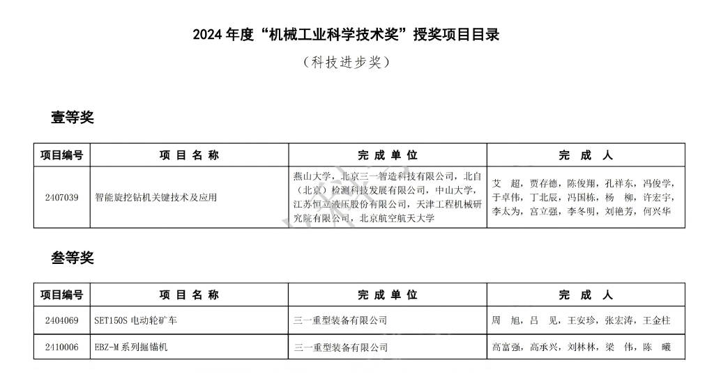 北京三一智造科技有限公司“智能旋挖钻机关键技术及应用”项目荣获科技进步奖一等奖;三一重型装备有限公司“SET150S电动轮矿车”项目、“EBZ-M系列掘锚机”项目荣获科技进步奖三等奖。