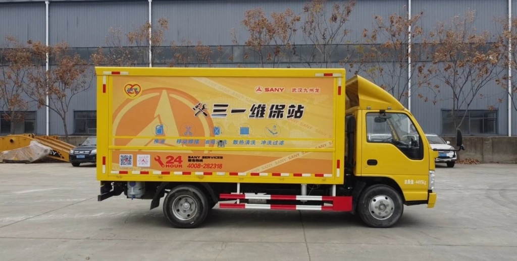 三一武汉九州龙一站式维保站,采用的是箱式货车,这种车型具有轻巧灵活的特点,动力也十分充足有力,能够轻松适应各种复杂的野外工况工作环境。无论工地处于多么偏远的山区、泥泞的洼地或是崎岖的山坡,这辆箱式货车都能顺利抵达,为挖机提供及时的维保服务。